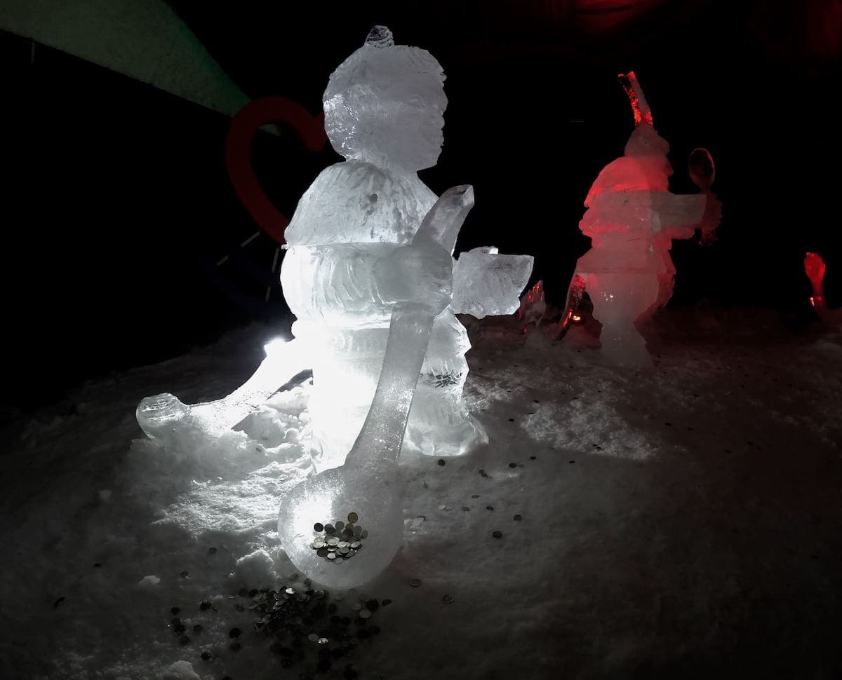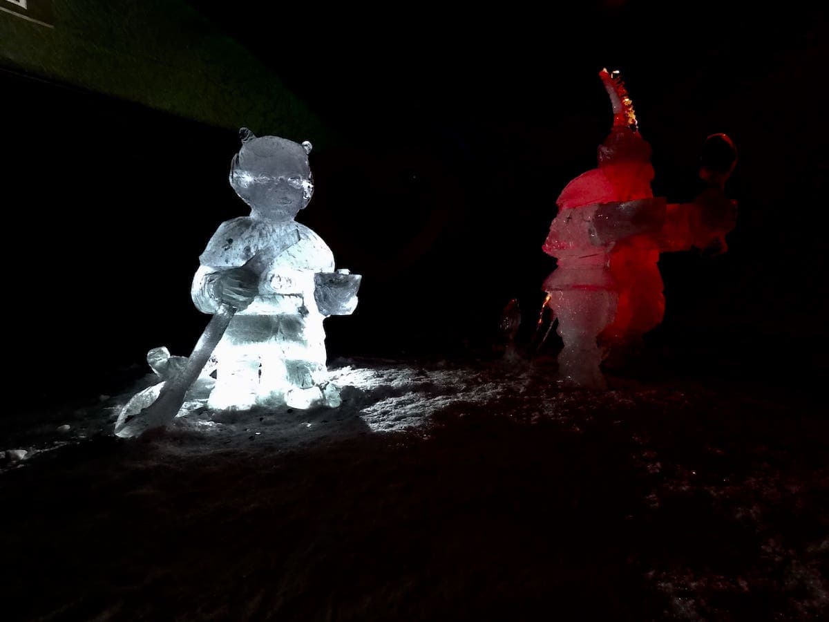 Unikátní zážitek zasluhuje expozice ledových soch orientovaná do dvou tematických bloků, která je bez vstupného. Ledové peklo a Dračí doupě vám představí neuvěřitelné umění, kterého jsou lidé schopní. V prvním stanu na vás čekají čerti s kotly a v Dračím doupěti spatříte princeznu v zámku, kterou střeží drak. Na tyto nádhery, které jsou nasvíceny profesionálním osvětlením, se spotřebovalo čtyřicet tun ledu! Nám osobně se nejvíce líbila velká hlava ďábla s vystrčeným jazykem, která byla nasvícena červeným světlem. Dávalo to peklu tu správnou atmosféru. Nutno však podotknout, že si na prohlídku budete muset pár minut počkat a minuty se mohou protáhnout i v hodiny.