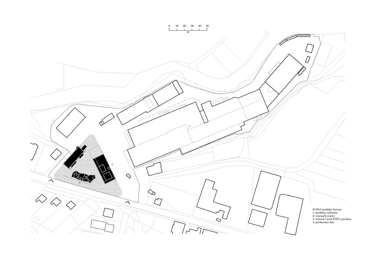 Samotným pracím na výzkumném centru předcházel projekt urbanistického řešení celého výrobního areálu. Cílem bylo navrhnout zázemí společnosti KOMA MODULAR jako areál, který není jenom místem výroby, ale také poskytuje prostor pro odpočinek zaměstnanců, návštěvníky, odbornou i laickou veřejnost a především lokální komunitu, v níž společnost KOMA hraje důležitou roli jednoho z největších zaměstnavatelů v kraji.