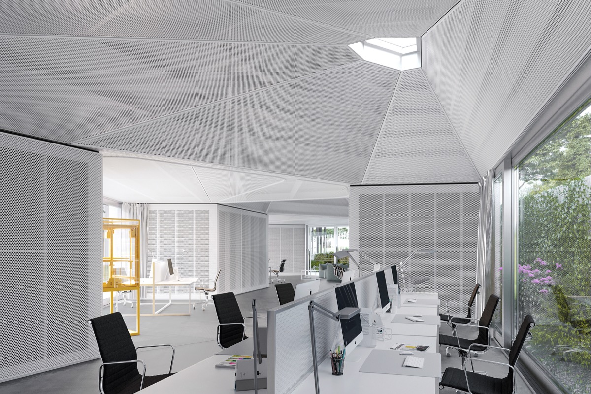Prostor je tak fragmentován a nevzniká efekt sezení v obrovské hale. Open space je dále možné více či méně opticky dělit závěsy a řadou dalších mobilních prvků vybavení jako promítacími monitory anebo 3D tiskárnami. Pracovní prostředí je dostatečně prosvětleno skrz velkorysé celoprosklené plochy mezi moduly a ze shora skrze dvojici světlíků, které zvyšují světlou výšku, umožňují prostoru nadýchnout se a pomáhají v členitosti open spacu.