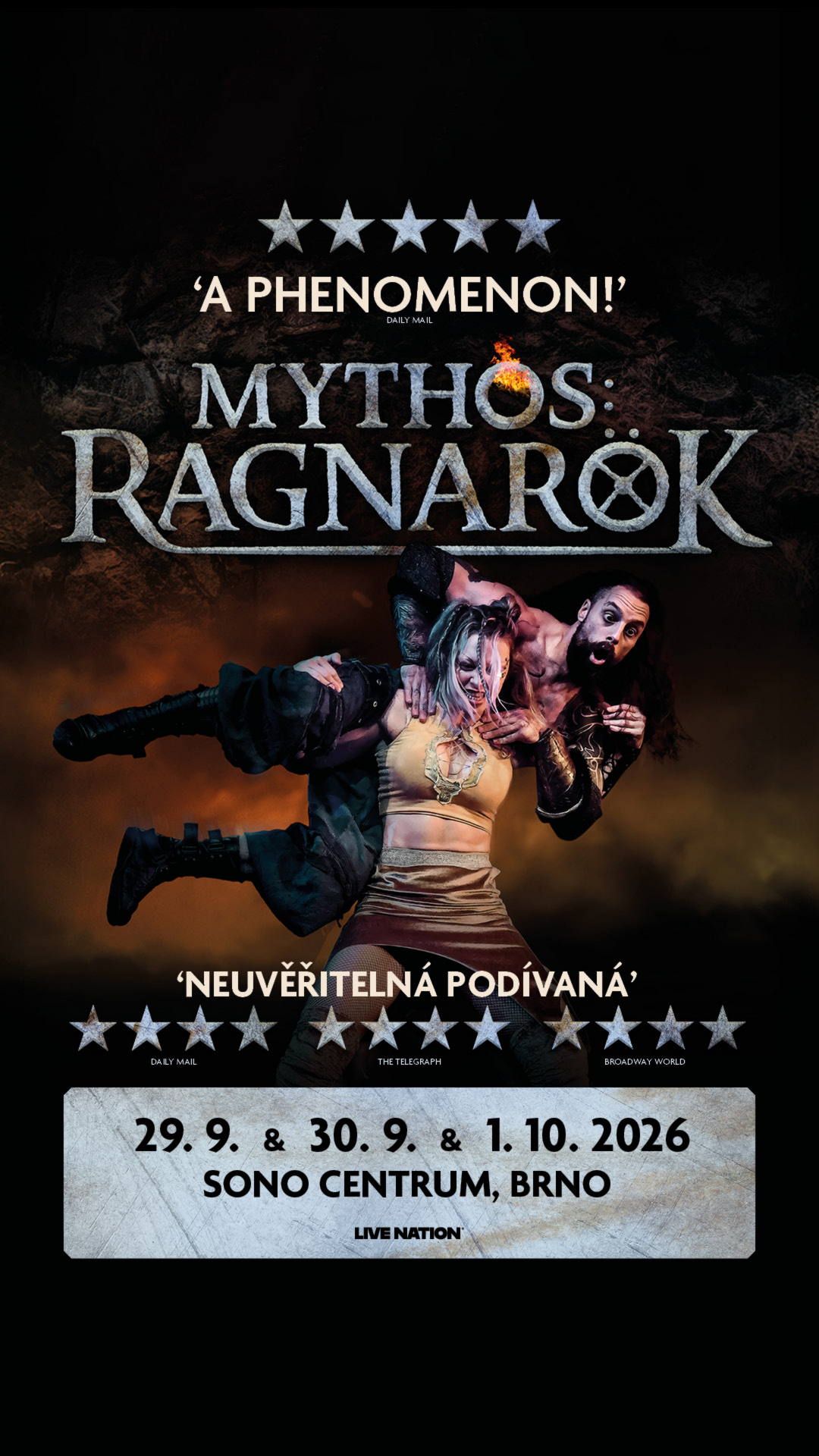 Severská mytologie ožívá! Legendární britské divadelní představení Mythos: Ragnarök přináší své jedinečné představení do České republiky. Jde o výjimečnou kombinaci profesionálního wrestlingu a divadla inspirovaného Shakespearem, kde se dramatické dialogy střídají s živými souboji přímo na jevišti. Účinkující jsou profesionálně trénovaní wrestleři a herci zároveň, díky čemuž se legendy o Thórovi, Lokim a Freyje mění v energickou, humornou a fyzicky strhující podívanou vrcholící hrozbou Ragnaröku.