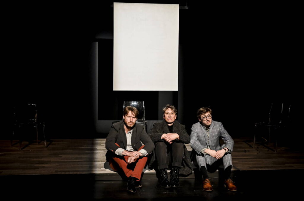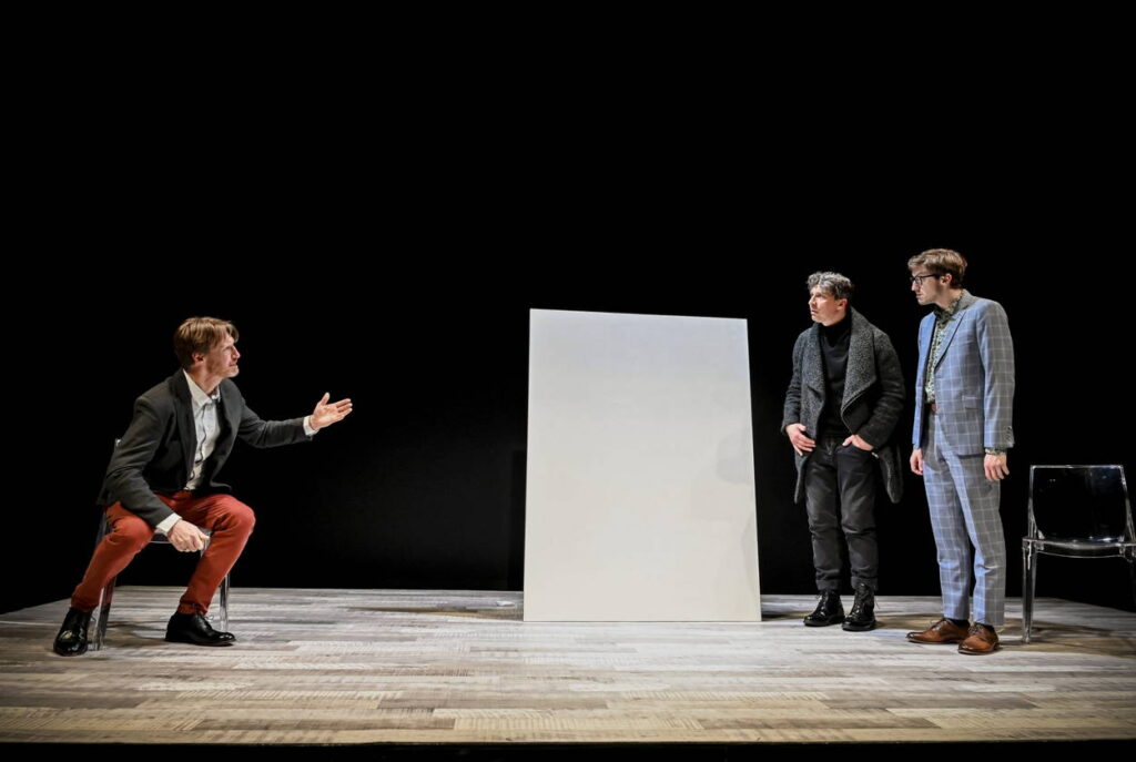 Scéna je opravdu minimalistická. Tři plastové židle a onen bílý obraz, který je ovšem na jevišti přítomen jen částečně. Rekvizit není o nic víc. Tím spíše vynikají kvality textu a herecké práce, které jsou v tomto případě na velmi vysoké úrovni.