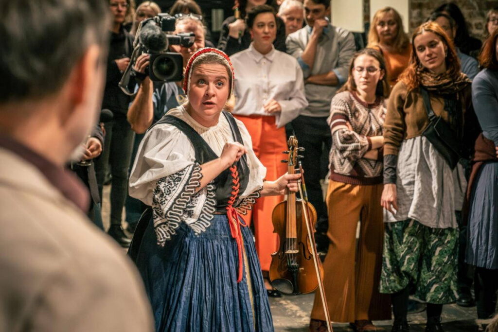 Inscenace má podobu vernisáže. Diváci stojí okolo stěn a herecké akce se odehrávají víceméně uprostřed nevelké Sklepní scény Divadla Husa na provázku. Publikum dostane do rukou také nezbytný welcome drink, na stolečcích se vyskytují křupky. Navození uvolněné atmosféry má své opodstatnění. Etnolog (Dušan Hřebíček) se svojí ženou Etnoložkou (Markéta Matulová) do toho jdou čelem, když nám hned na začátek zahrají některé písně z První kytice národních prasáren Karla Jaroslava Obrátila. Vesnický lid konce devatenáctého století, kdy Obrátil popěvky a říkanky přímočaře erotického obsahu sbíral, nešel pro slovo daleko. Zároveň se od obou bodrých výzkumníků v oblasti lidových zvyků dozvídáme leccos o původu právě těch výrazů, které budí největší pozornost, nebo o krajových variacích jejich použití. A také o pohlavním životě vesnické mládeže, která si od sexuálního pnutí způsobeného dospíváním, ulevovala mnohdy nápaditým, někdy až bizarním způsobem.