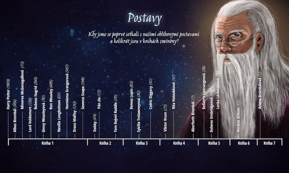 Infografika sestává z pěti samostatných grafů, které sledují, kolikrát se v textu vyskytují různá kouzla, kdy se poprvé objevují různé populární postavy a kolikrát jsou celkově v knihách zmíněny, kteří magičtí tvorové dominují jednotlivým knihám, počet zmínek jednotlivých magických objektů a srovnání počtu výskytu 30 pozitivních a 30 negativních slov.
