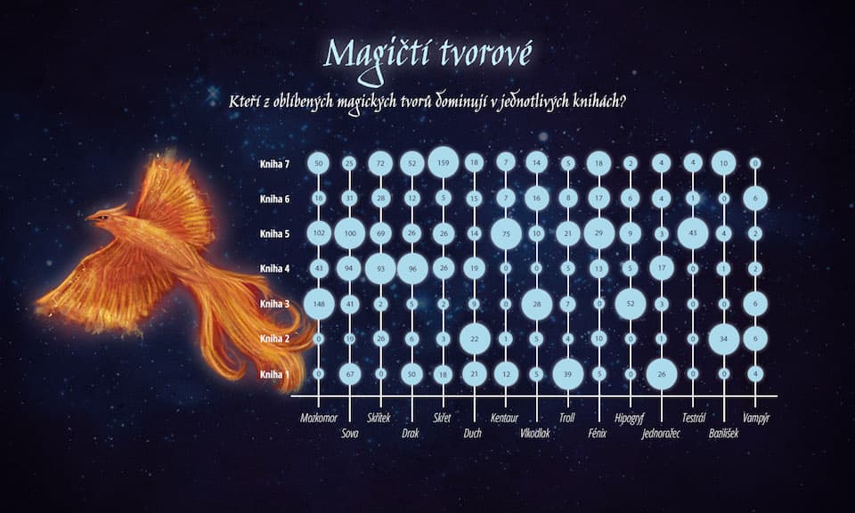 V tomto grafu lze najít 15 oblíbených magických tvorů a dozvíte se, která kniha je nejbohatší na zmínky o těch, které máte nejraději. Pokud jste fanouškem draků či elfů, nejvíce zmínek o těchto magických bytostech najdete ve čtvrté knize. Pokud vás nejvíce baví pasáže o duších, doporučujeme druhou knihu. Pokud vás však nejvíce fascinují mozkomorové, rozhodně si otevřete třetí knihu.