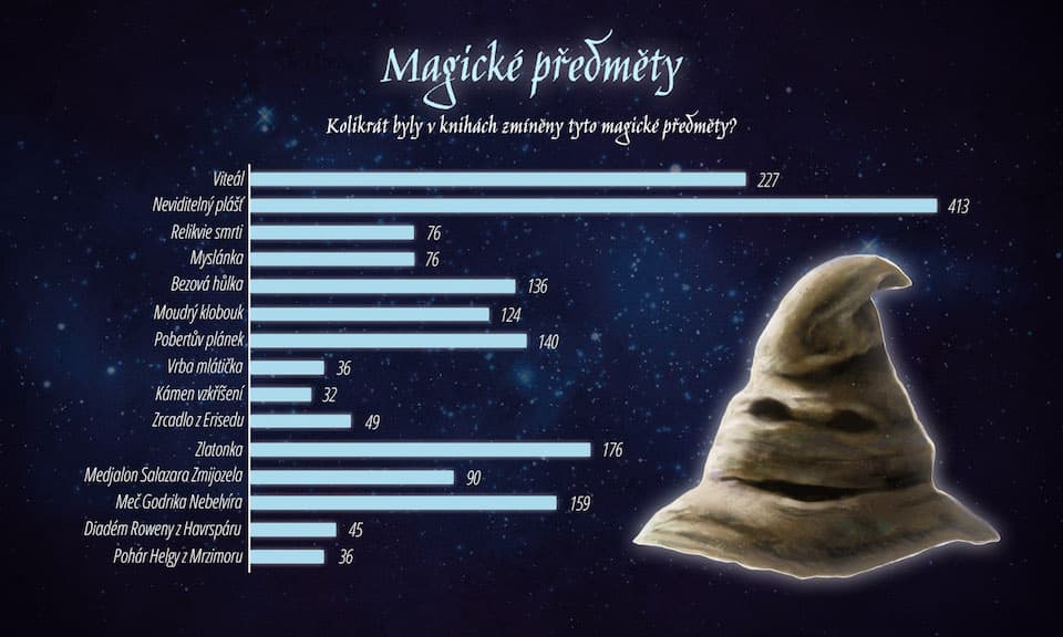 Tento graf vám ukáže, kolikrát jsou jednotlivé magické objekty zmíněné v textu knih. Do celkového počtu zmínění se počítal buď výskyt přesného názvu objektu (například Vrba mlátička) nebo jeho obecné pojmenování (klobouk, plášť, meč, atd.). Obecná pojmenování byla manuálně zkontrolována a započítaly se pouze ty zmínky, které se týkaly daných magických objektů. Výsledný graf vám ukáže, kolikrát v příběhu narazíte na Zlatonku, Zrcadlo z Erisedu nebo Moudrý klobouk.