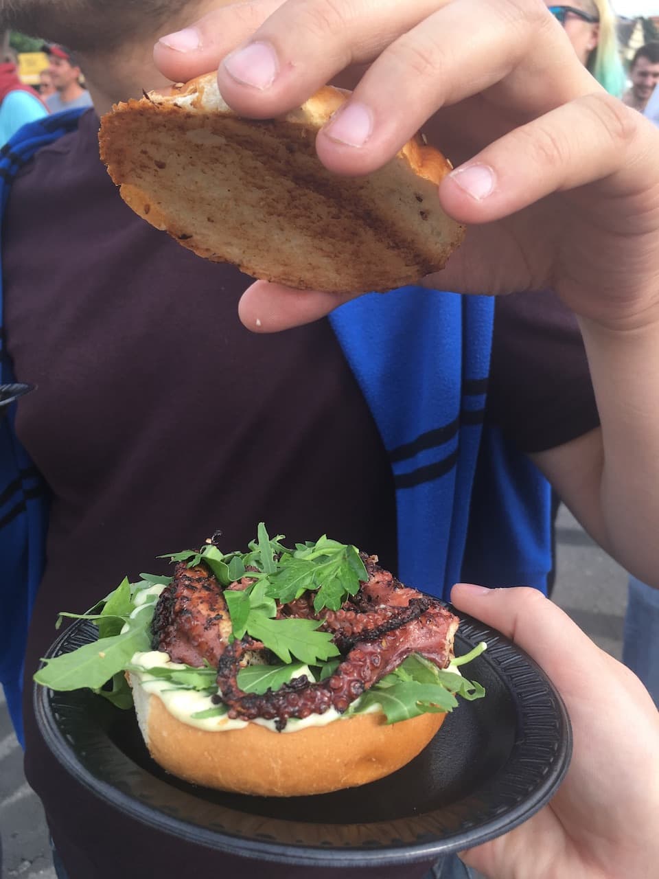 Ve snaze obsloužit co nejrychleji bylo maso nedodělané. Škoda, potenciál tam byl. Závěrečnou jsme si dali u stánku Delish, kde jsme ochutnali jejich klasický Delish Bacon Burger (hovězí, slanina, cheddar, cibule, rajče) a chobotnicový speciál. Limetkovo-česnekové aioli, které jej doprovázelo, bylo super, já česnek miluji. Ale jeho výrazná chuť šla na úkor chuti chobotnice.