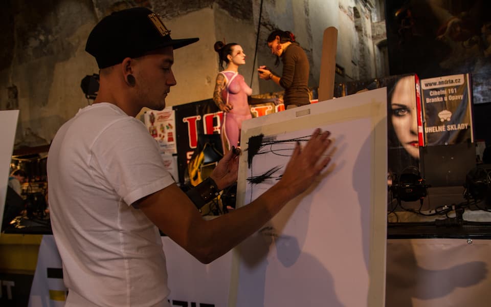 Celý dvoudenní festival se odehrával v kostele sv. Václava, kde byla skvělá tetování doplněná o další kousek umění – ať už šlo o fresky na stropě kostela, nebo přidání několika obrazů od různých umělců.