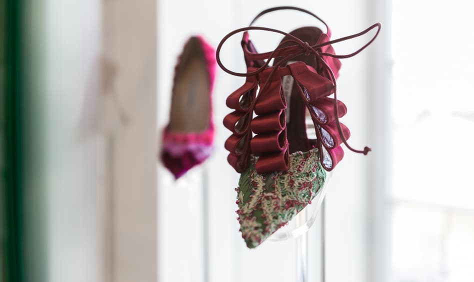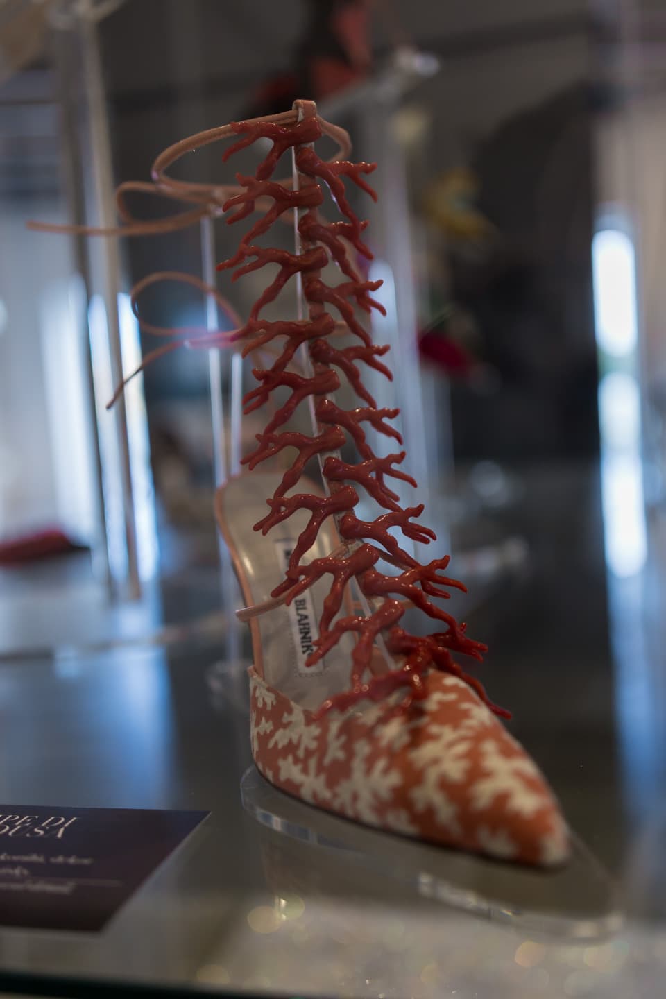 Avšak nejdůležitější součástí výstavy jsou boty samotné. A musím říci, že zde se opravdu zadařilo. Retrospektivní výstava mapuje 45 let Blahnikovy práce a k vidění je zde okolo 200 bot. Ty jsou rozděleny do šesti tematických celků: Core, Gala, Umění a architektura, Geografické vlivy, Příroda a Materiály. Samotnou obuv doplňuje i pár desítek kreslených návrhů a je zajímavé porovnat tyto kresby s výslednou obuví. Každý vystavený střevíc je navíc popsán a vy můžete obdivovat širokou škálu materiálů, z nichž Blahnik obuv vyráběl. Síťovina, šifón, satén, semiš, krokodýlí kůže, ještěrčí kůže, pony kůže, tvíd, tartan a mnoho a mnoho dalších. Blahnik se nebojí ani využívat takové materiály, jako jsou korály. To z jeho bot činí opravdové unikáty.