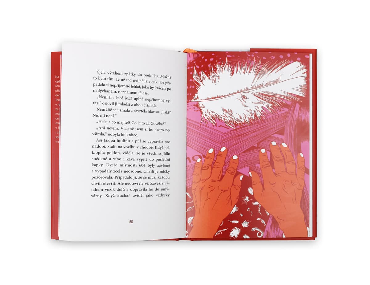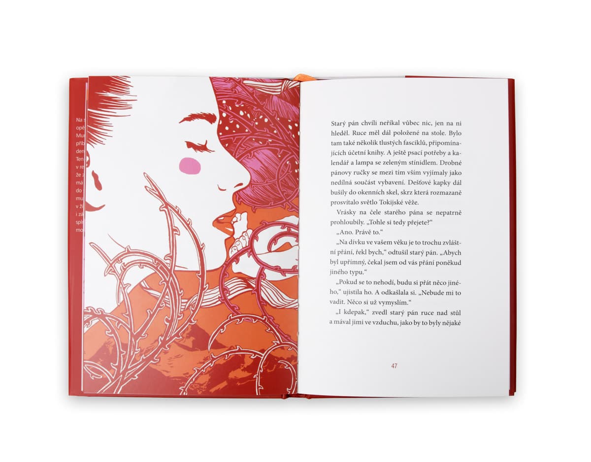 Vynikající povídku doplňují úchvatné kresby Kat Menschik, tentokrát jsou laděny do červené, bílé a růžové barvy. Chvílemi se zde objeví i oranžová, v této barvě je i záložka knihy.
