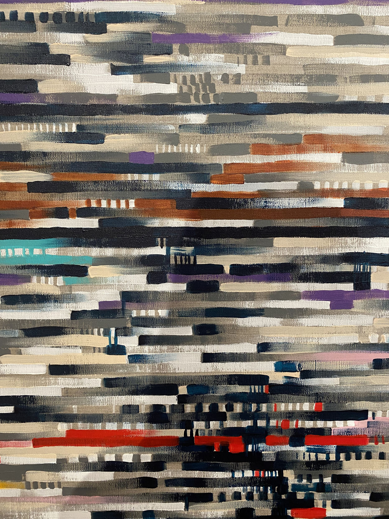 Samotná výstava se dělí do tří, možná samostatných, možná propletených okruhů. První z nich je cyklus Tinnitus, pod nějž spadá i největší a tím pádem nejnápadnější plátno „Růžový a bílý šum“. Obraz odkazuje na TRT terapii, záleží však na pozorovateli, zda v něm vyvolá spíše terapeutické či naopak znepokojivé cítění.