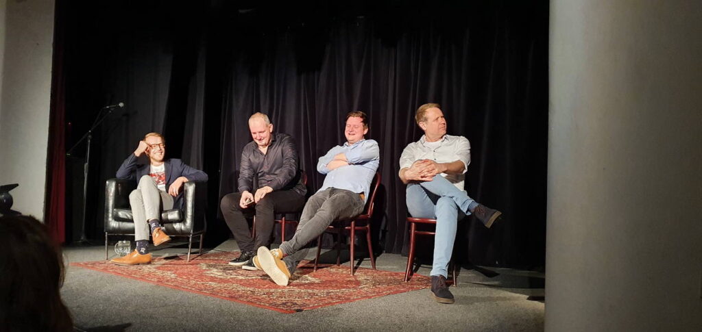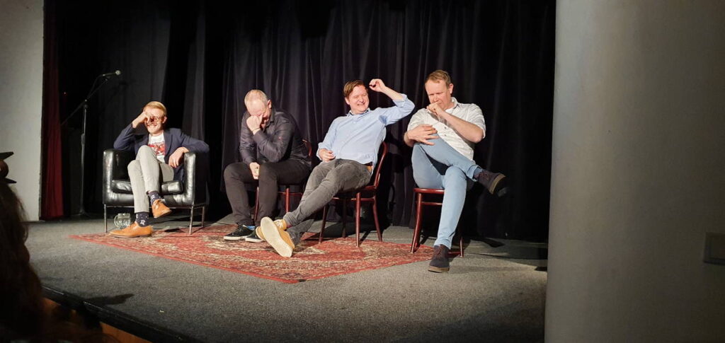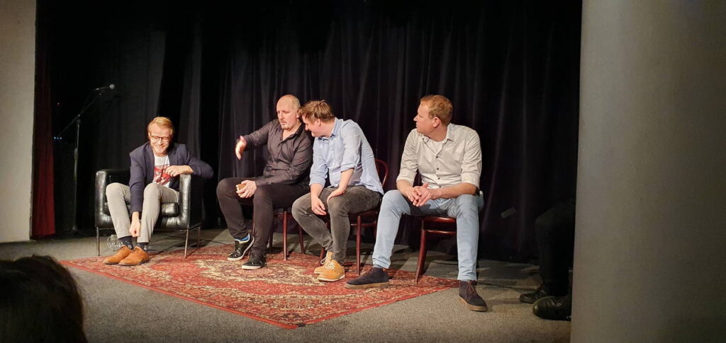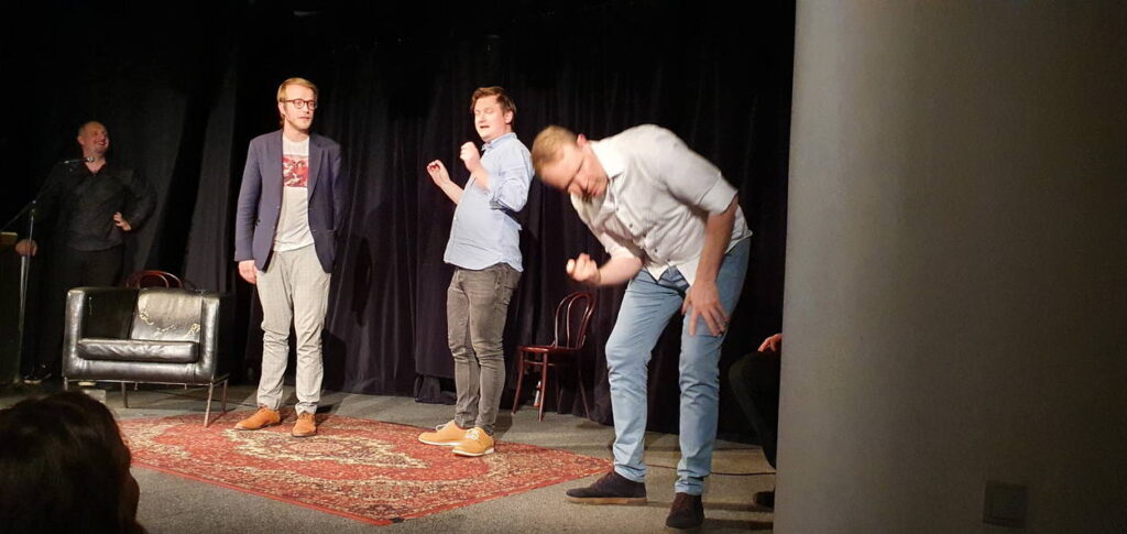 Kdo by to neznal, jeden moderátor a k němu host či hosté. Všichni sedí pohodlně v křesílkách na jevišti a buď hluboce filozoficky nebo humorně povídají. V horším případě si hosté myslí, že jde o hlubokou filozofii a ve skutečnosti to vyvolává spíše útrpný smích. Moderátor má tady docela důležitou roli. Přitom ale – až na prchavé okamžiky v úplném úvodu – nikdy na jevišti nehraje přesilovku. V tom nejhorším případě jsou síly vyrovnány. No, tak na něco takové v Měšťanské besedě při 321Jedem rovnou zapomeňte. Tady jste totiž na impro talk-show. Tady hrají přesilovku moderátoři a neočekávaných je tu mnohem více věcí, než jen odpovědi na otázky hosta.