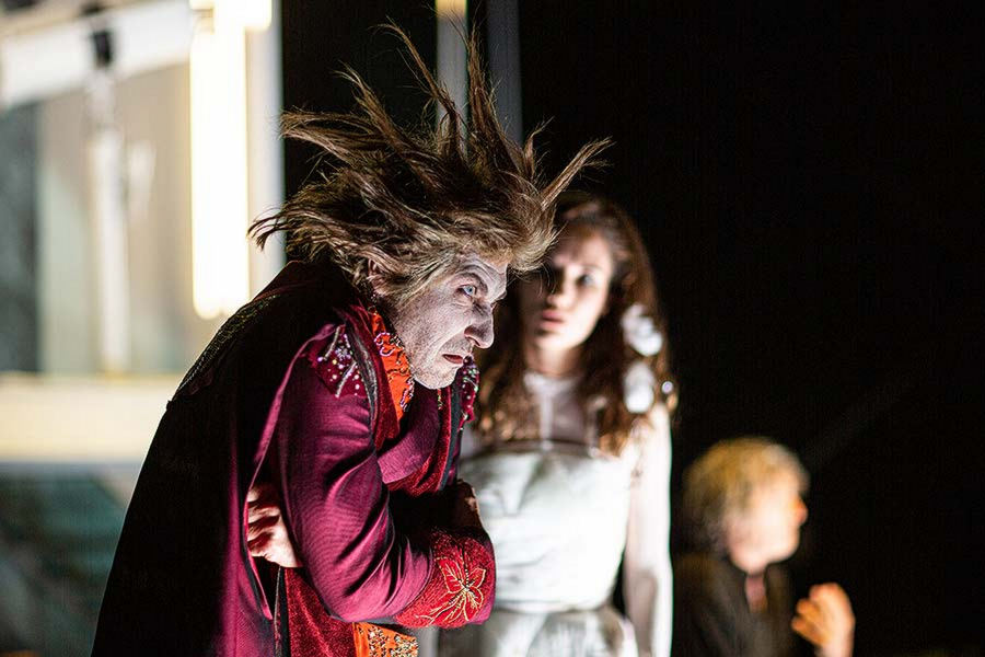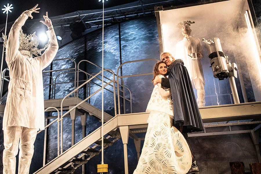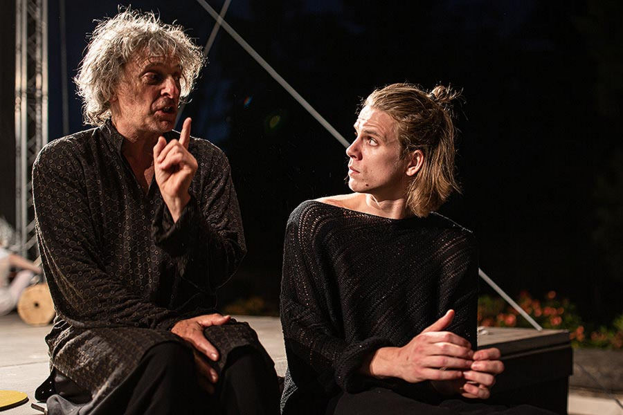 Příběhu zpočátku dominuje postava vévody Prospera vypuzeného ze svého panství, který je zároveň schopným mágem. David Prachař jej představuje jako rozhodného vládce ostrova plného podezřelých nadpřirozených sil. Duch Ariel, kterého vysvobodí a zaváže si ho ke službě, je v podání Csongora Kassaie bytostí sice éterickou, která ale především projevuje smysl pro humor. Ostatně i nehmotná bytost vyhlíží především moment, kdy už bude mít konečně padla.
