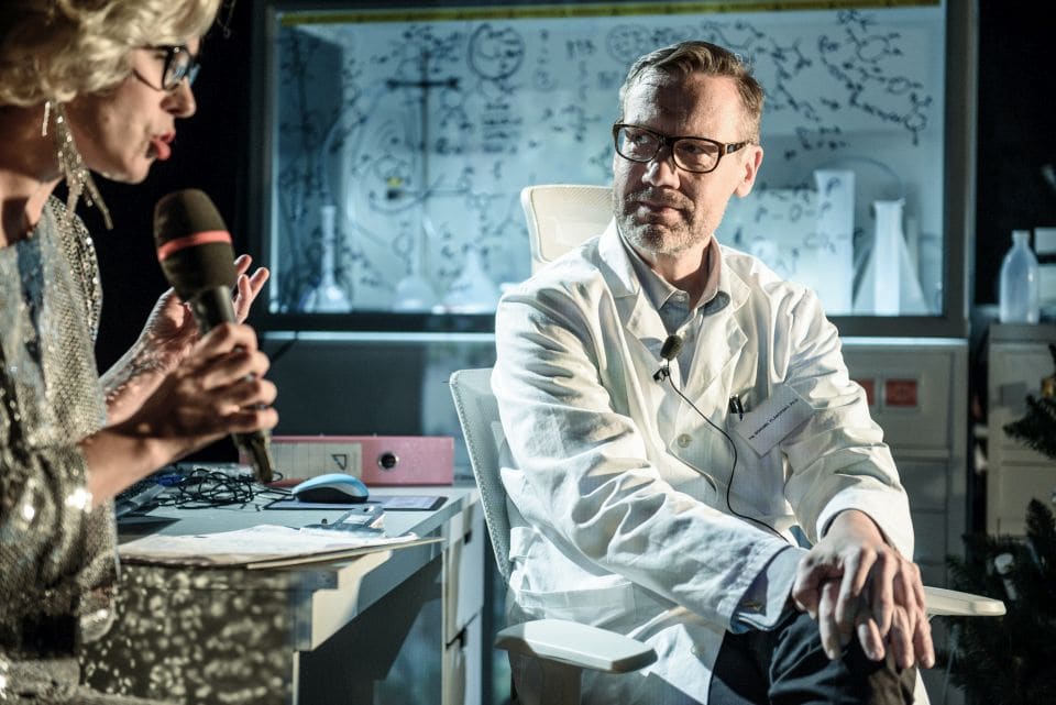 Press space and continue. Překlad jako vystřižený z Google Translator vám dá název hry. A přece, právě zmáčknutím mezerníku na světelné klávesnici se rozhrne opona a začíná dobrodružný příběh odehrávající se v jedné z laboratoří Akademie věd České republiky. Scéna je rozdělena na dvě části, v přední se nachází laboratoř a za prosklenými okny vidíme buď park, nebo vesmír. A chybět samozřejmě nesmí disco koule. Kostýmy jsou střízlivé, vystačíme si s bílými věděckými plášti. Až na Božidaru Plánovskou (Martina Preissová), která se po scéně promenuje v bláznivých kreacích. Sekunduje jí už jen Strašlivý Sisyfos v řecké tóze.