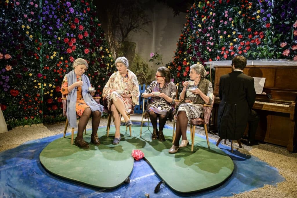 Tři přítelkyně se schází v rozkvetlé zahradě na odpolední čajový dýchánek. Barevná záplava květů obklopuje jejich křesla umístěná na velkém leknínovém listu a částečně přechází i na ženy samotné v podobě jejich pestrobarevných šatů. Čajník se na povel z ničeho nic zhmotní a do ticha a klidu zní klasická hudba, kterou má na svědomí pianista. Idylu slunečného odpoledne narušuje paní Jarretová (Zuzana Kronerová) v šedých šatech s mývaly. Výrazné brýle a tmavé rozpuštěné vlasy ji odlišuji od upravených dam. Sezením na zahradní židli vypadá i o dost menší a je na první pohled jasné, že je zde jakýmsi vetřelcem. Působí jako „špionská“ sousedka, která nemá na práci nic lepšího, než sledovat, kde se co šustne.