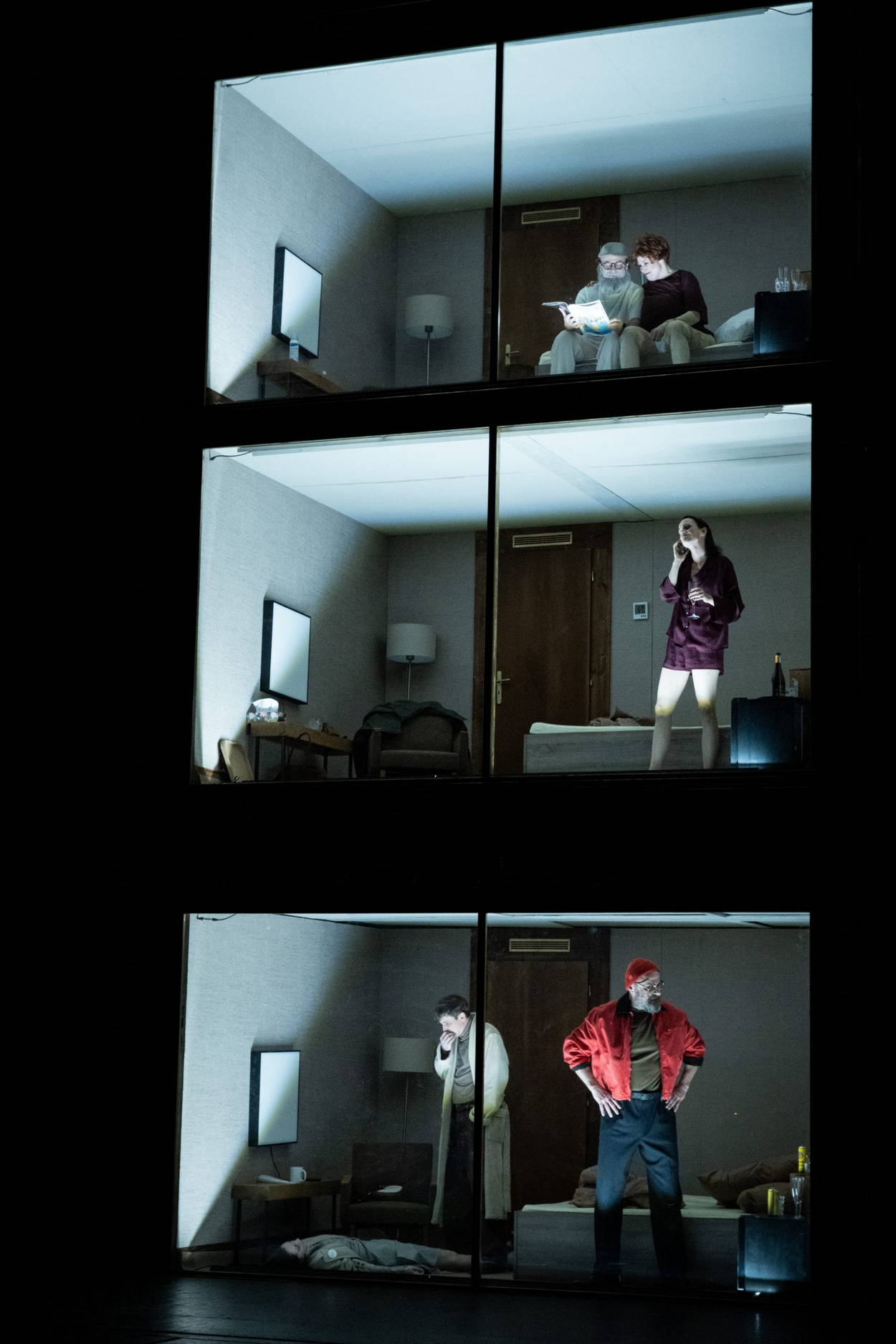 Na jevišti probíhá střídavě šest příběhů. Každý z nich se odehrává ve zvláštním hotelovém pokoji. Příběhy, které vidíme, jsou plné v podstatě trýznivých vztahů, manželských nebo partnerských zápasů a některé z nich končí tragicky. Propojení motivů z jednotlivých her do souvislého toku dává inscenaci potřebnou dynamiku tam, kde by mohla bezvýchodnost klasické předlohy působit až ubíjejícím dojmem.