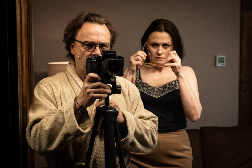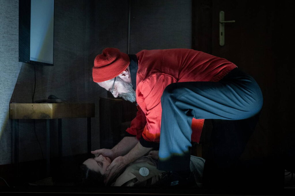 Hra je náročná i z hlediska hereckých výkonů. Téměř každý aktér představuje tři postavy. A každá z nich má charakteristický projev, gestikulaci, temperament. Potřeba rychlých změn „identity“ je tedy nadprůměrná. Na hladkém průběhu vyprávění bylo patrné, že činoherní soubor toto zadání zvládnul bez problémů. Stone snad ještě víc než Strindberg u mužských postav zdůrazňuje slabost a neschopnost poradit si se životem. Tomáš David, Tomáš Šulaj i Vojtěch Blahuta si každý nacházejí vlastní cestu, jak scénicky vyjádřit jejich rozdílné a přece v něčem dost podobné osudy. Výjimkou je Martin Sláma v roli recepčního, který svým klidem, jako by z jiného světa, vytváří kontrastní rovinu příběhu.