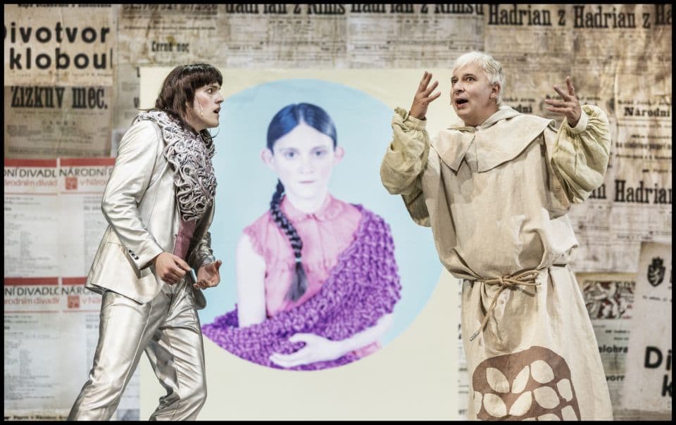 Scénické poznámky nám praví, že „máme-li na Klicperu nahlédnout nezkresleně, pak bez malovaných kulis“. Na začátku tak vidíme jen jednu kulisu složenou z plakátu k Mlynářově opičce, který je zároveň Mariiným portrétem, a plakáty k uvedení Hadriána z Římsů. Ta se záhy zvedá a odhaluje bílé stěny s černými puntíky. Scéna je tak bohužel nicneříkající a se hrou vůbec nekoresponduje. Spíš působí, jako by tam zůstala zapomenutá z předchozího představení, tak málo se scénografie k této inscenaci hodí. Přesto je třeba vytvořit alespoň nějakou atmosféru. K čemuž režisérovi Štěpánu Páclovi posloužila barevná světla.