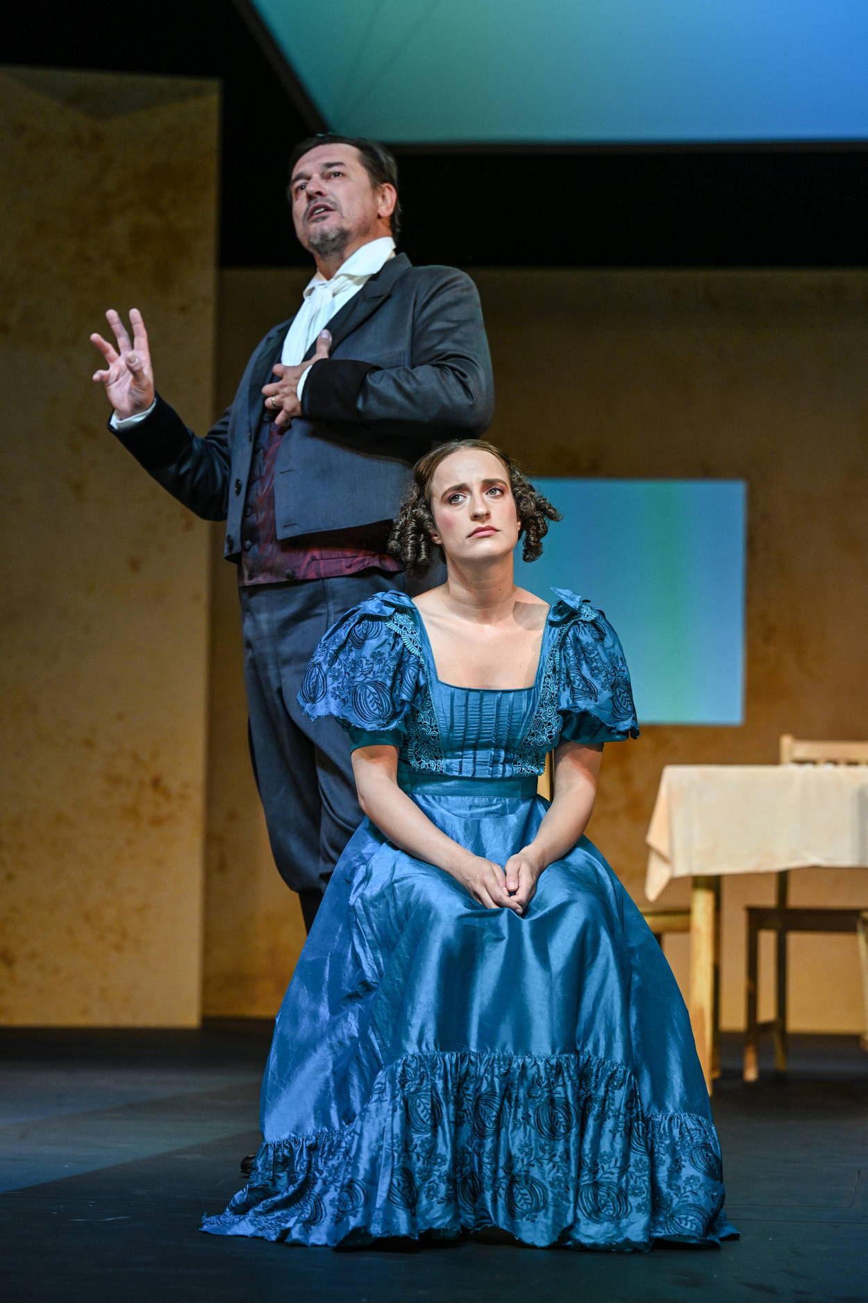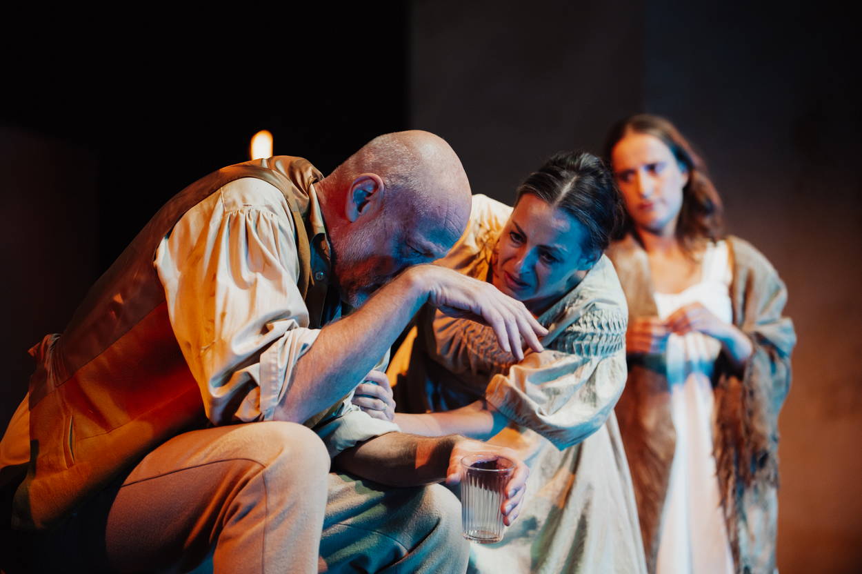 Jistý kontrast je také patrný mezi tradičně řešenými kostýmy a scénou, která je naopak pojata až minimalisticky. Stěny i jednoduchý nábytek jsou ze světlého dřeva, které působí dojmem moderního městského interiéru, což rozostřuje naše vnímání příběhu jako dramatu zasazeného do bezpečně vzdálené minulosti.