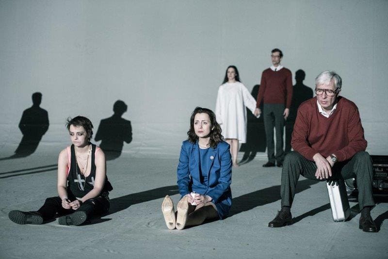 Stejně chaotická je během první části představení i scéna sama. Několik židlí, lednička, pouliční lampa, odpadky, matrace, barely s vodou, dům převrácený na střechu, štěrk. To vše, jen aby to v druhé části zmizelo a zůstalo bílo a prázdno. Perfektní kontrast mezi divokou a rozvernou první částí hry a truchlivým závěrem.