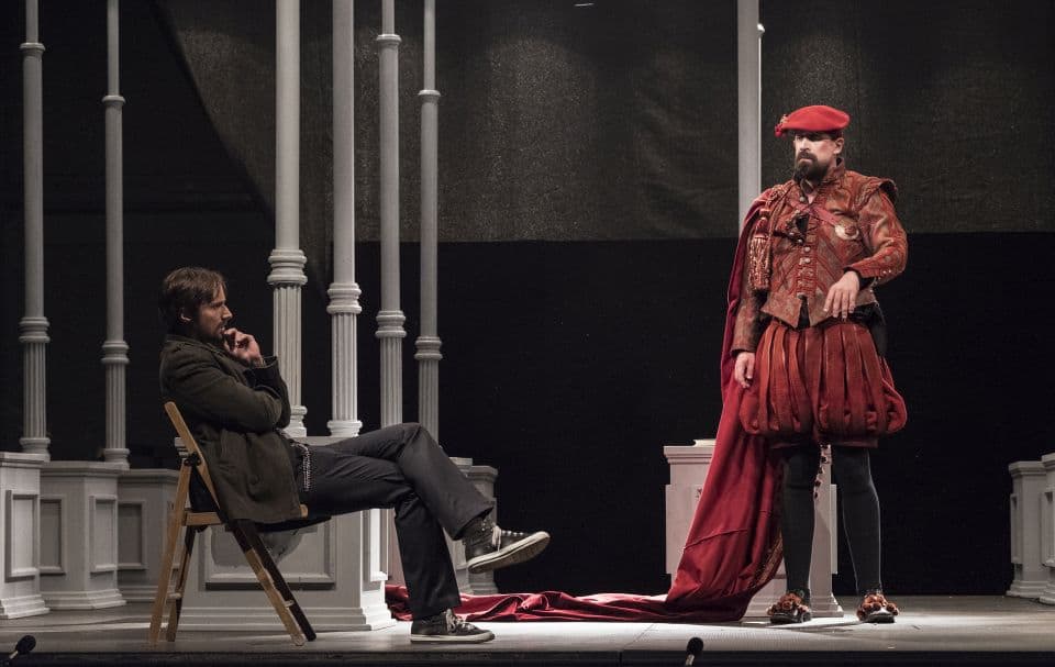 Mimochodem, herci v první půli nastavují i zrcadlo divákům – když přijíždí herecká společnost (zastoupená jedním z herců v podání Pavla Šimčíka), vyžádá si Hamlet v doprovodu Polonia přednes monologu. Zatímco Hamlet zaujatě poslouchá, Polonius se nahlas nudí. Poté, co je Hamletem zpražen, že se ofrňuje nad náročnými kusy a dal by přednost jen lechtivým komediím, sice ztichne, zato se ale snaží otevřít si sáček s buráky. A je to právě velký nešvar Letních shakespearovských slavností, že konzumace sektů a chipsů neprobíhá o přestávce, ale přímo při představení.