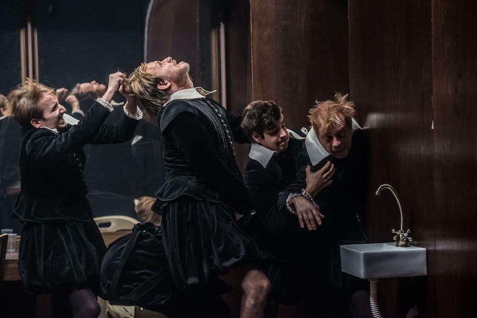 Hamleti začínají ve tmě. Slyšíte jen hlasy, které se domlouvají, jak představení začít. Po každém nápadu se rozsvítí, vyzkouší se a zase se zhasne, protože se zjistí, že to je blbost. A hledá se další varianta. Od samého začátku zazní absurdity a vyhrocenosti. Například režisér herce nabádá, aby se nebáli využít potenciálu prostoru – otočné jeviště, mechanicky se pohybující nábytek a posuvný strop! Výsledkem je, že po rozsvícení všech sedm herců čumí na strop.
