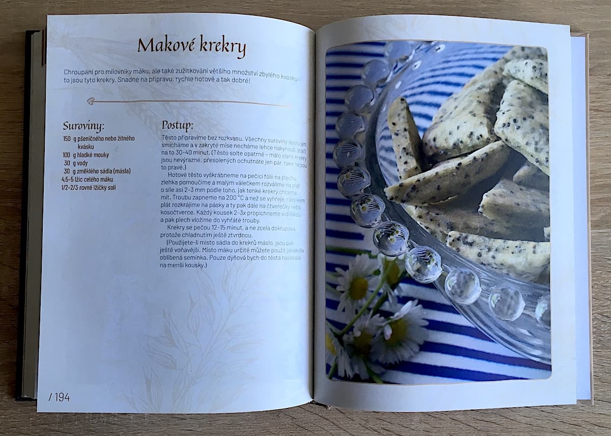 Pak už se můžete pustit do samotného pečení. Kniha obsahuje přes 50 receptů na různé chleby, vlastně by vám měl na každý týden v roce vyjít nějaký jiný. Je libo jarní chléb s kopřivami, slunečnicový s melasou, moravský cibulář, ořechový s mrkví nebo dokonce chléb z fermentované ovocné vody? Komu by tohle všechno nestačilo, může se inspirovat v další kapitole knihy. Ta obsahuje recepty na drobné pečivo jako langoše, makové krekry, špekové dalamánky a další. A jelikož se chleba i pečivo málokdy jedí jen tak, je poslední část věnovaná laskominám, které k chlebu můžete zakousnout.