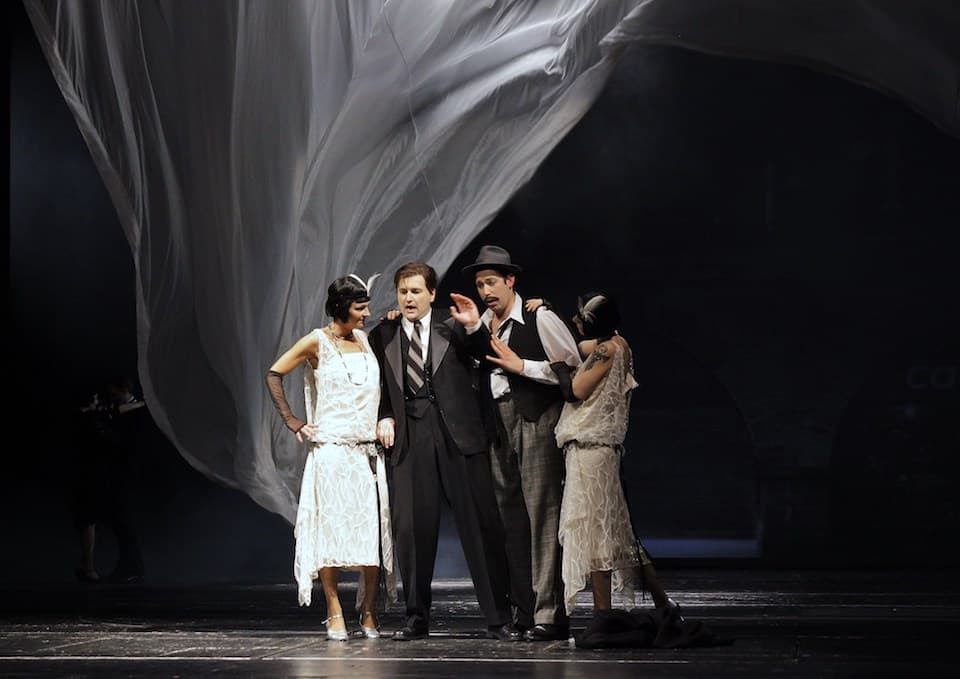 Když už zmiňujeme projekci, hrající významnou roli v tomto nastudování opery, nemůžeme opomenout ani vizuální stránku jako takovou, ať už jde o erotickou nahotu na pódiu (nepochybně odkaz na již zmiňovanou, jinak částečně vynechávanou, smyslnost původní předlohy) nebo kabaretní kulisy dotvářející scény s Carsonem či Tomešem, či hravé promítání společně s plazícím se kouřem uvozující pohyb.
