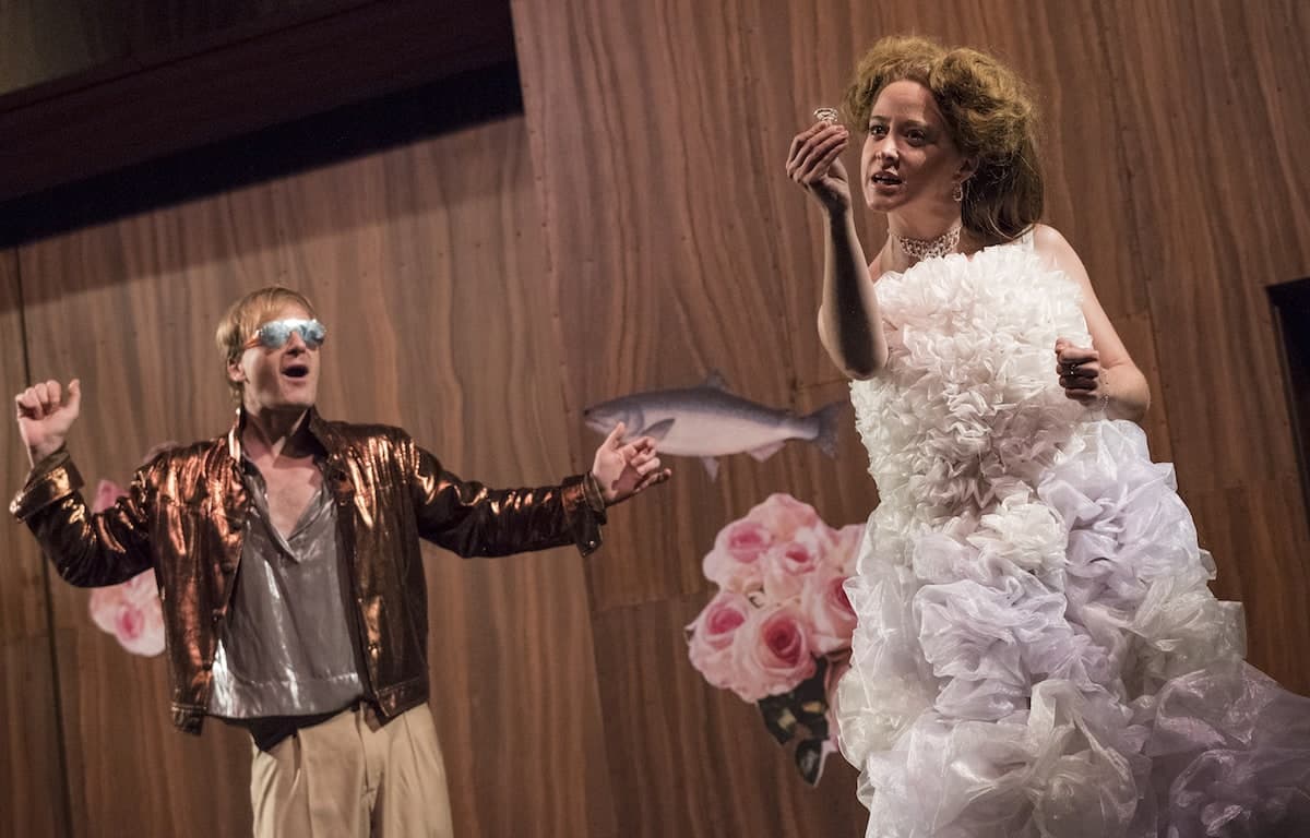 Kostýmy Jany Prekové v tomto dřevěném prostředí působí skoro jako pěst na oko, zvláště ty z francouzského dvora. Syté barvy, fialové a ryšavě oranžové paruky, růžové střevíce, kanárkově žluté čapce, flitrovaný kabátec a další části oděvu vyznívaly až přehnaně. Snad šlo o manifest ironizující pařížskou dvorskou módu z časů Ludvíků a posmívající se statutu Francie coby kolébce módy, snad šlo opravdu o inspiraci přejatou ze současných fashion weeků – nebylo by se čemu divit. Nicméně víc se mi líbily umírněnější kostýmy Heleny, hraběnky a Bertama.