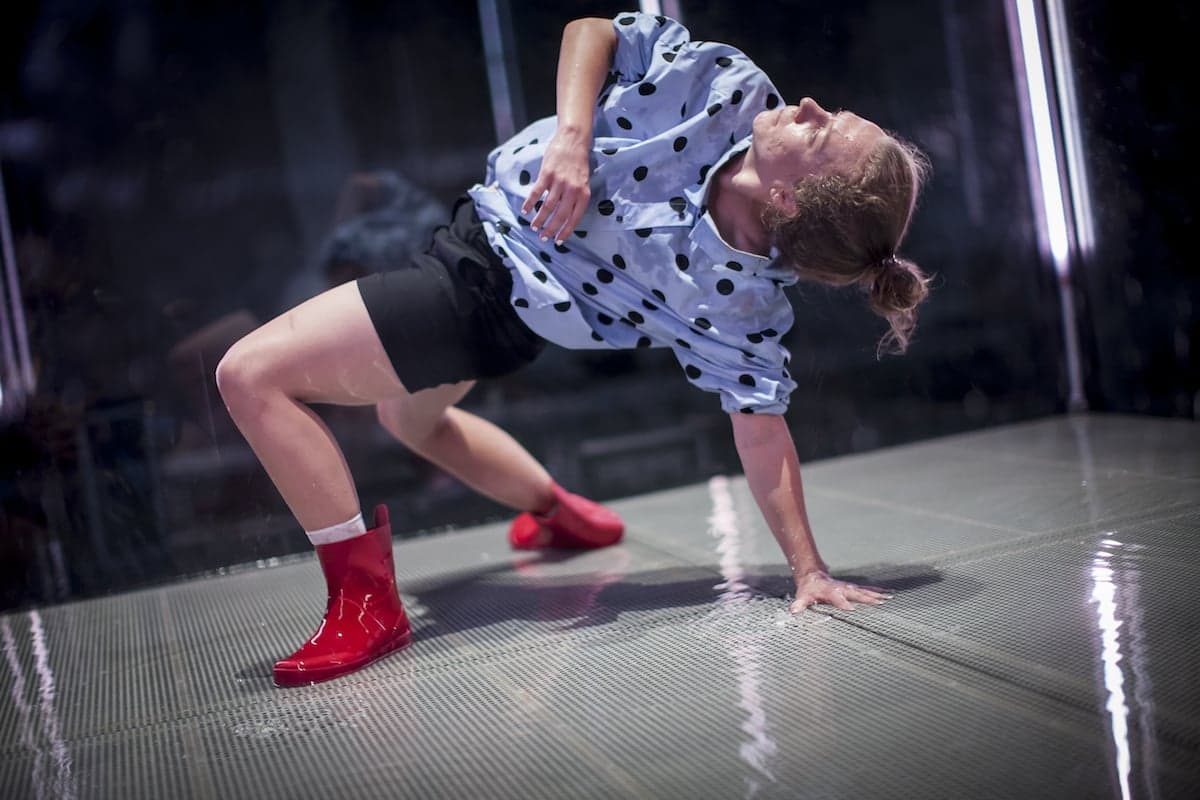 Samotné představení začíná chválou sytě červených holínek, které jsou pro postavu v akváriu kotvou, symbolem jistoty v rozháraném životě plném nepředvídatelných situací. Monolog o širokém výběru barev zmíněných holínek střídá monolog o škodlivosti chemických přípravků na zelenině a úvaha o pravdivosti médií. V poslední době tolik oblíbené téma (nejen) divadelníků. Voda mezitím pomalu prosakuje podlahou akvária a zároveň začíná kapat svrchu. Marný je boj Dvořákové, marně se pokouší kapky zachytit. A brzy stojí ve vodě do půli lýtek a rozjíždí se choreografie Dory Sulženko Hoštové.