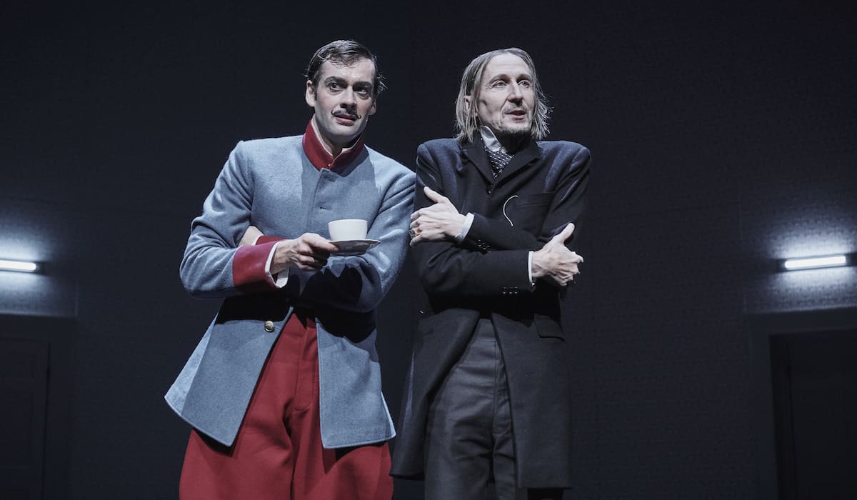 V gestech herci mistrně střídají dynamiku s nehybností, žádný pohyb nevyzní naprázdno. Ať už mám na mysli jezdeckou kavalerii, kdy si herci pomůžou choreografií s jezdeckými bičíky, nebo Kekesfalvovo nehybné sklonění se nad Hofmillerem, při kterém vypadá jako emocionální upír, vše skvěle zapadá do kontextu. Zásluhu na tom má i povedená scénografie, která využívá točny na jevišti a dynamiku některých částí tak ještě zdůrazňuje. Scéna samotná je rozdělena do tří stejných částí v podobě pokojů oddělených dveřmi.