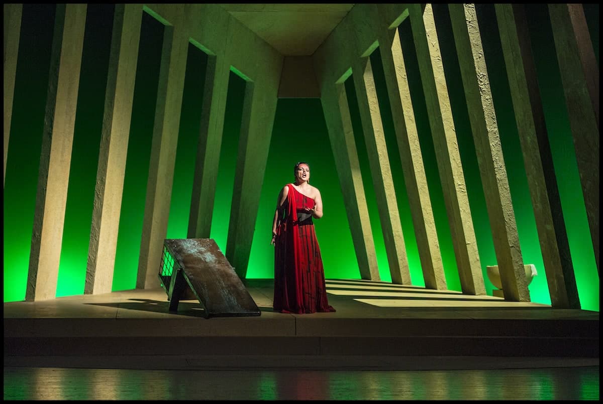 Kromě režie se Cura ujal i scény a světelného designu. Jednoduché sloupoví chrámu zužující se do tvaru trychtýře působilo na první dojem sice dobře, zvláště i díky změnám perspektivy za pomocí otáčivého jeviště, ovšem jen ve chvílích, kdy v něm stáli pouze sólisté. Pro desítky členů sboru se scéna změnila v konzervu sardinek.