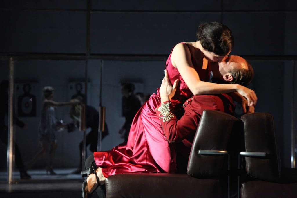 Hru režisér umístil kamsi do 30. let minulého století, čemuž odpovídají i kostýmy, které ale tím pádem ničím neohromí. Scéna působí jako lobby velké nadnárodní společnosti. Strohé dřevěné desky vtipně oživují hodiny s trojím časem – v Benátkách, ve Stratfordu a na Kypru. V pozadí je za sklem sterilně bílá místnost – střelnice. Celá scéna na mě jako na diváka působila chladně a neosobně. Snad to byl ale scénografův záměr…