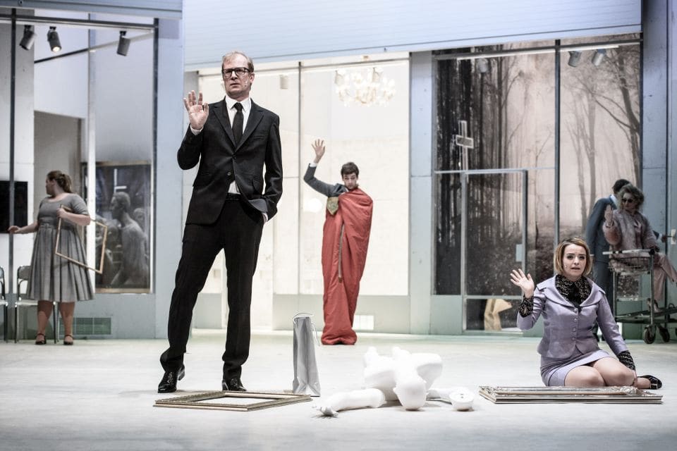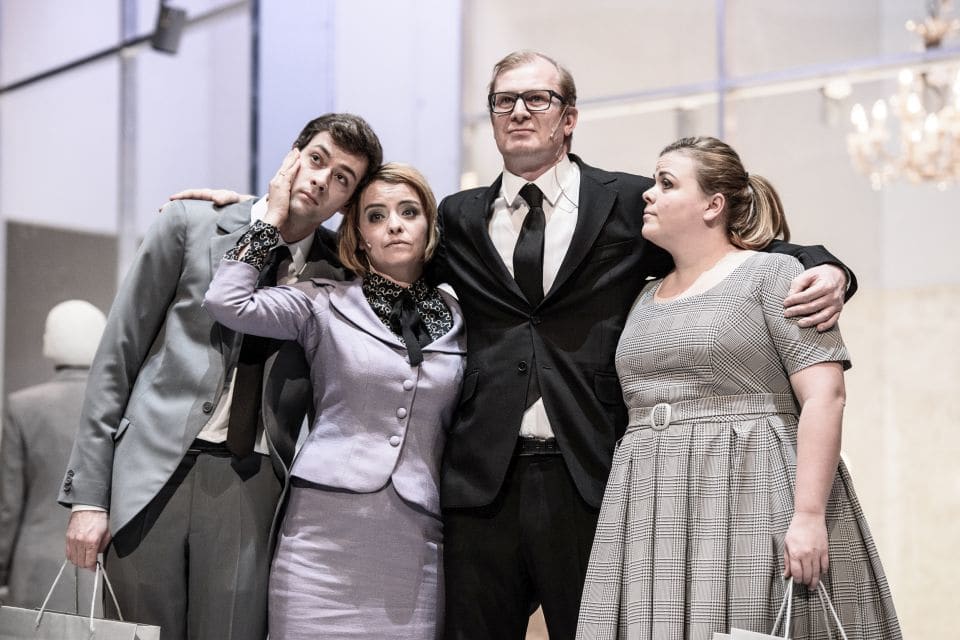 Scéna i dějovost pak působily místy přeplácaně, ale přesto to jakýmsi záhadným způsobem fungovalo a dávalo smysl. I když se na jevišti střídají krematorium se zoologickou zahradou a nákupním centrem. I když se na závěr jeviště otáčí dokola za vrčení šelmy kočkovité, i když jsou části scény zakrývány posunovacími roletami, i když sbor – Panoptikum – chodí s chladně bílými maskami bez výrazu. Zkrátka to do sebe vše zapadalo. Ač představení trvalo téměř dvě hodiny bez přestávky, po celou dobu si udrželo mou pozornost. Ačkoli je pravda, že přestávka, aby si divák od Karla Kopfrkingla a jeho směřování trochu oddechnul, by také neuškodila.
