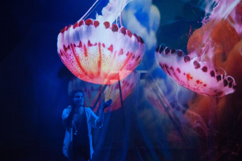 Co lze jistě vychválit, bylo řešení scény. Vzhledem k tomu, že se na jevišti vystřídali pouze tři herci, museli si se vším poradit sami. A tak například když Stařec, v jehož roli se ocitli postupně všichni tři účinkující, usedl na loďku, zbylí dva kolegové v rohu šplouchali ve vědrech s vodou pokaždé, kdy náš hlavní hrdina zajel s pádly pod hladinu. Zajímavé byly také obrazy a efekty moře promítané na téměř průhledném plátně před jevištěm nebo rozsvícení lucerniček v úplné tmě za doprovodu příjemné, lehce nostalgické hudby. Působilo to velmi autenticky a dodalo to tu správnou atmosféru.