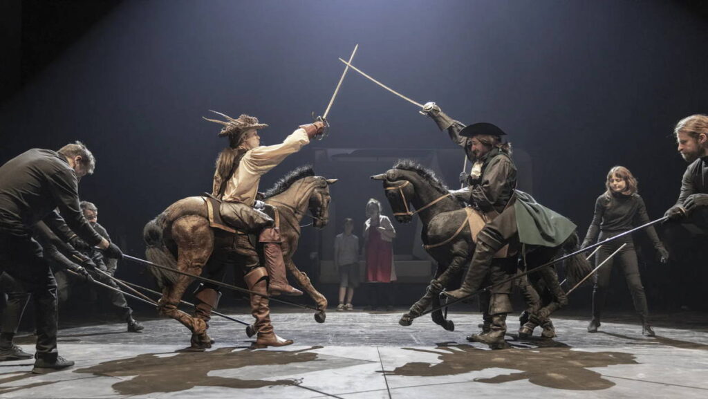 Inscenace pro konkrétní scény využívá předností té které divadelní formy. Souboje mušketýrů s protivníky jsou nejprve komickou slovní bitvou, jindy se herci soukají do velkých loutek koní kvůli jezdeckému duelu, další střet je pro změnu akrobatickou choreografií. Celek nicméně z estetického hlediska nepůsobí roztříštěně, naopak se prezentuje jako zcela soudržný, výrazově nadmíru bohatý jevištní tvar, který podněcuje fantazii a neustále má čím překvapit, což jistě ocení i nejnáročnější z diváků, děti.