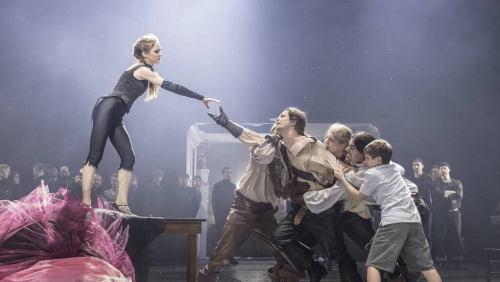 V inscenaci je uplatňován epický princip (tedy přiznání, že vyprávíme fikci). Jednak je tu Babička, která Chlapce provádí důležitými pasážemi Tří mušketýrů; a jednak učinkující opakovaně upozorňují na to, že hrají divadlo a mluví o něm mezi sebou. Komunikace neprobíhá jen mezi jevištěm a hledištěm, ale také se zákulisím. Zde je usazen téměř celý inscenační tým, připravený kdykoli zasáhnout do dění. Intimitu scén o dvou, třech hercích střídají davové pasáže; jednou je akce umístěna na forbínu, jindy se hrací prostor protáhne až ke dveřím na Ovocný trh.