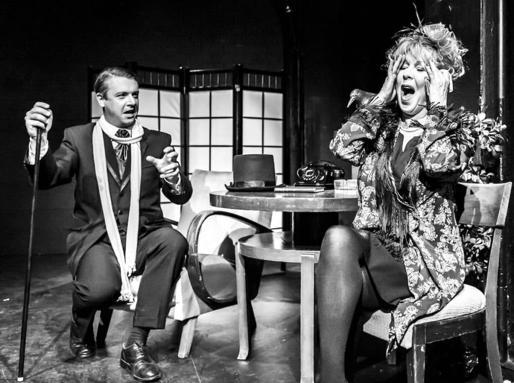 Na všechny z nich bude v průběhu představení vzpomenuto. Celou prvorepublikovou plejádu však ztvární pouze čtyři herci – Vlasta Žehrová, Kateřina Steinerová, Ondřej Kavan a Zbyněk Fric. Naštěstí se díky rozdílným kostýmům i odlišné jevištní mluvě jednotlivých postav dá určit, koho zrovna hrají, a nevzniká zmatek. Přesto představení na mě ve výsledku působilo chaoticky. Dílem za to mohly swingové písně, jež měly podtrhnout „atmosféru tehdejší rozporuplné doby“.