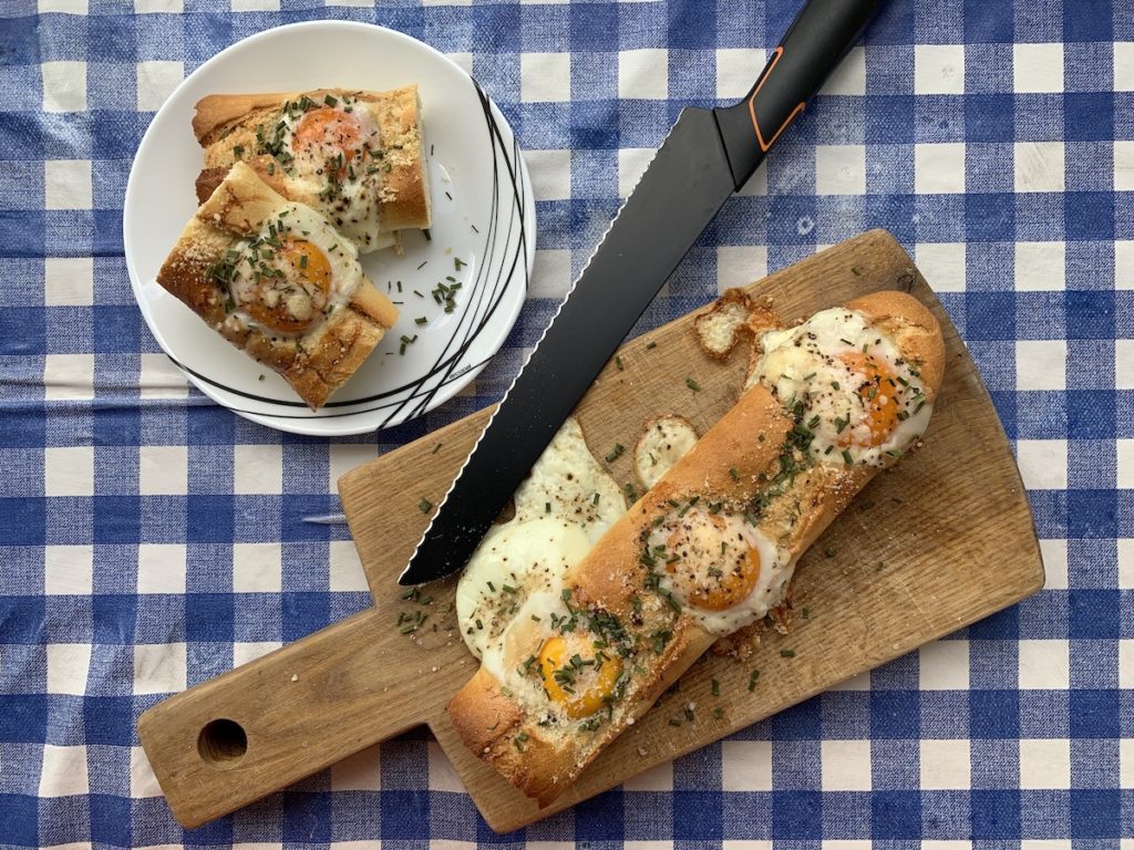 Do francouzské (nebo jiné vámi oblíbené) bagety vykrojte šest koleček a vydlabejte důlek. Bagetu si připravte na plech s pečicím papírem. Žampiony, jarní cibulku i slaninu nakrájejte na drobné kousky a opečte na pánvi. Směs vložte do důlku v bagetě tak, aby vám zbylo dost místa pro vejce. Do každého důlku v bagetě rozklepněte vejce. Posolte, opepřete a zasypte strouhaným parmezánem. Dejte zapéct do trouby (předehřáté na 150–200 °C, záleží na troubě) asi na deset minut – žloutek by měl zůstat částečně tekutý. Bagetu nakrájejte na jednotlivé dílky a podávejte.