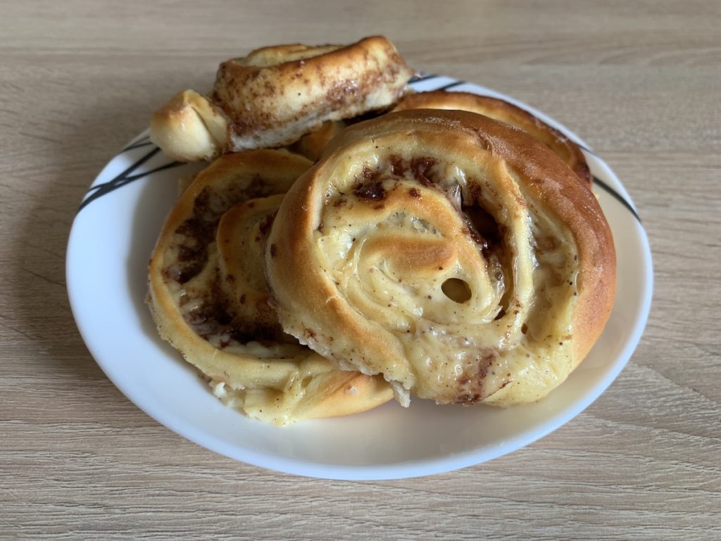 Kvasnice rozdrobte do hrnečku, zasypte lžičkou cukru, lžičkou mouky a přidejte trochu mléka. Promíchejte a nechte kvásek vyběhnout do dvojnásobného objemu. Mezitím do mísy nadávkujte další suroviny na těsto: mouku, cukr, máslo, mléko a žloutek. Přidejte kvásek a vše promíchejte. Vypracujte hladké těsto, které nebude lepit, a dejte na hodinu vykynout. Mezitím si připravte vanilkový pudink podle návodu – tedy rozmíchejte prášek v 0,5 litru mléka, přidejte dvě lžíce cukru a přiveďte k varu. Za stálého míchání vařte do zhoustnutí. Do hotového pudinku přidejte skořici dle chuti. Vykynuté těsto rozválejte na placku. Rozetřete pudink a přisypte na menší kousky podrcenou čokoládu. Celé to zabalte jako roládu. Následně rozkrájejte na jednotlivé šneky a dejte na plech s pečicím papírem. Potřete bílkem rozmíchaným s trochou mléka a vložte do trouby předehřáté na 200 °C. Pečte dozlatova.