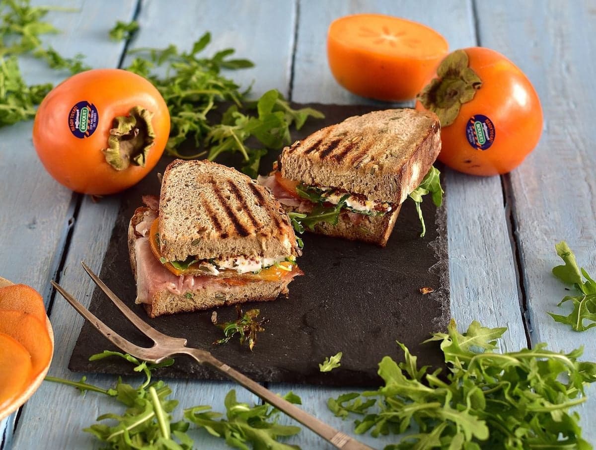 Potřete hořčicí krajíce chleba. Na 2 plátky dejte prosciutto, plátky kaki, hrst rukoly a kozí sýr. Vytvořte sendvič a v pánvi zahřejte máslo. Grilujte, dokud se sýr neroztaví a chléb se neopeče dozlatova.