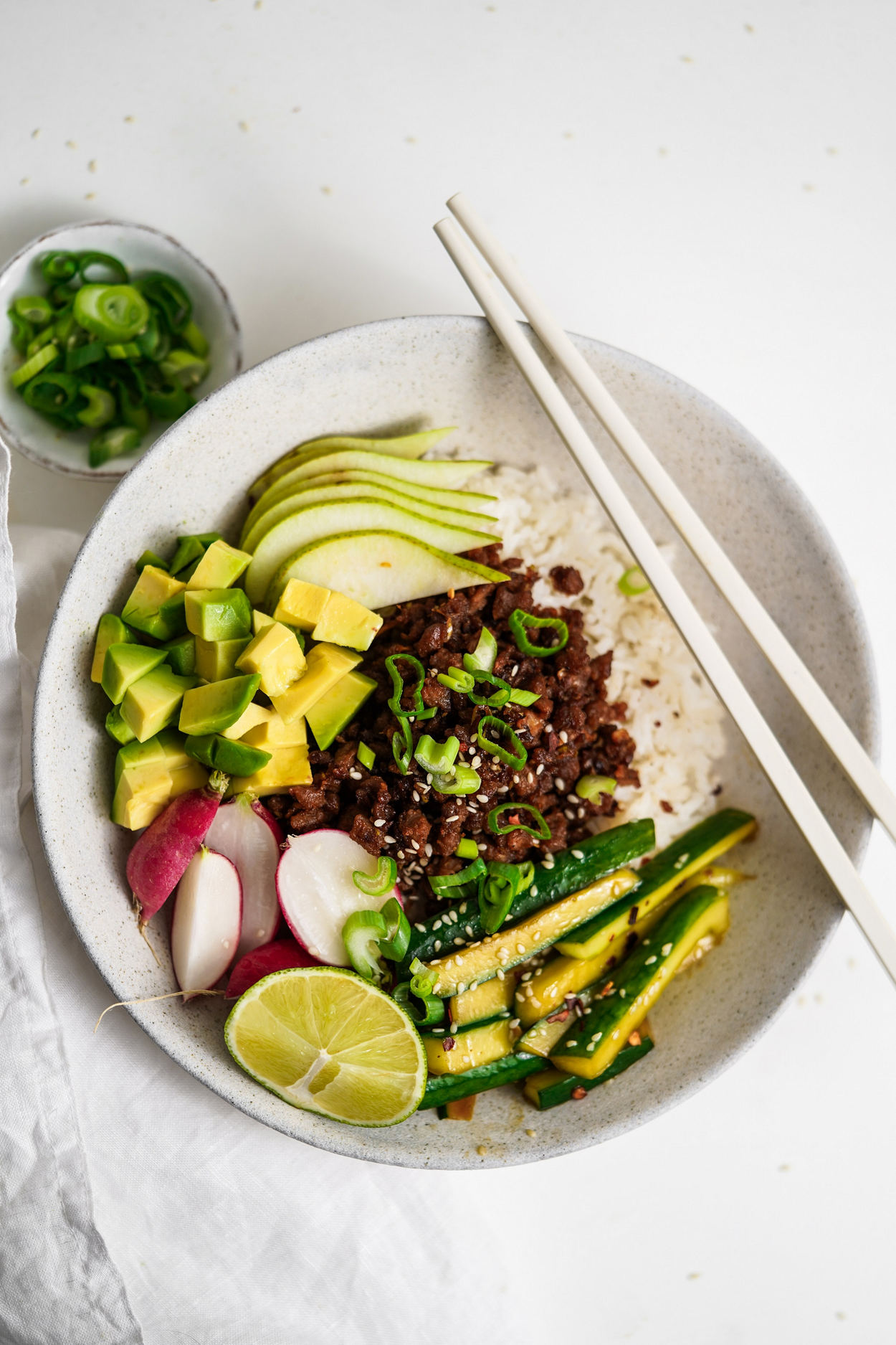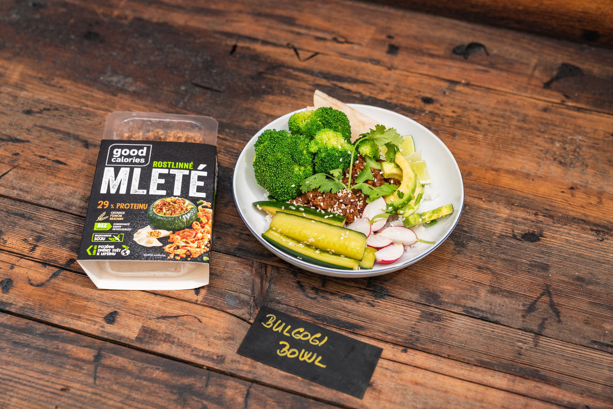 Druhým receptem je Bulgogi Bowl, což v překladu znamená „ohnivé maso“, i když v našem případě se opět nejedná o maso, ale o Rostlinné mleté od Good Calories, to lze využít všude tam, kde bychom běžně pracovali s klasickým mletým.