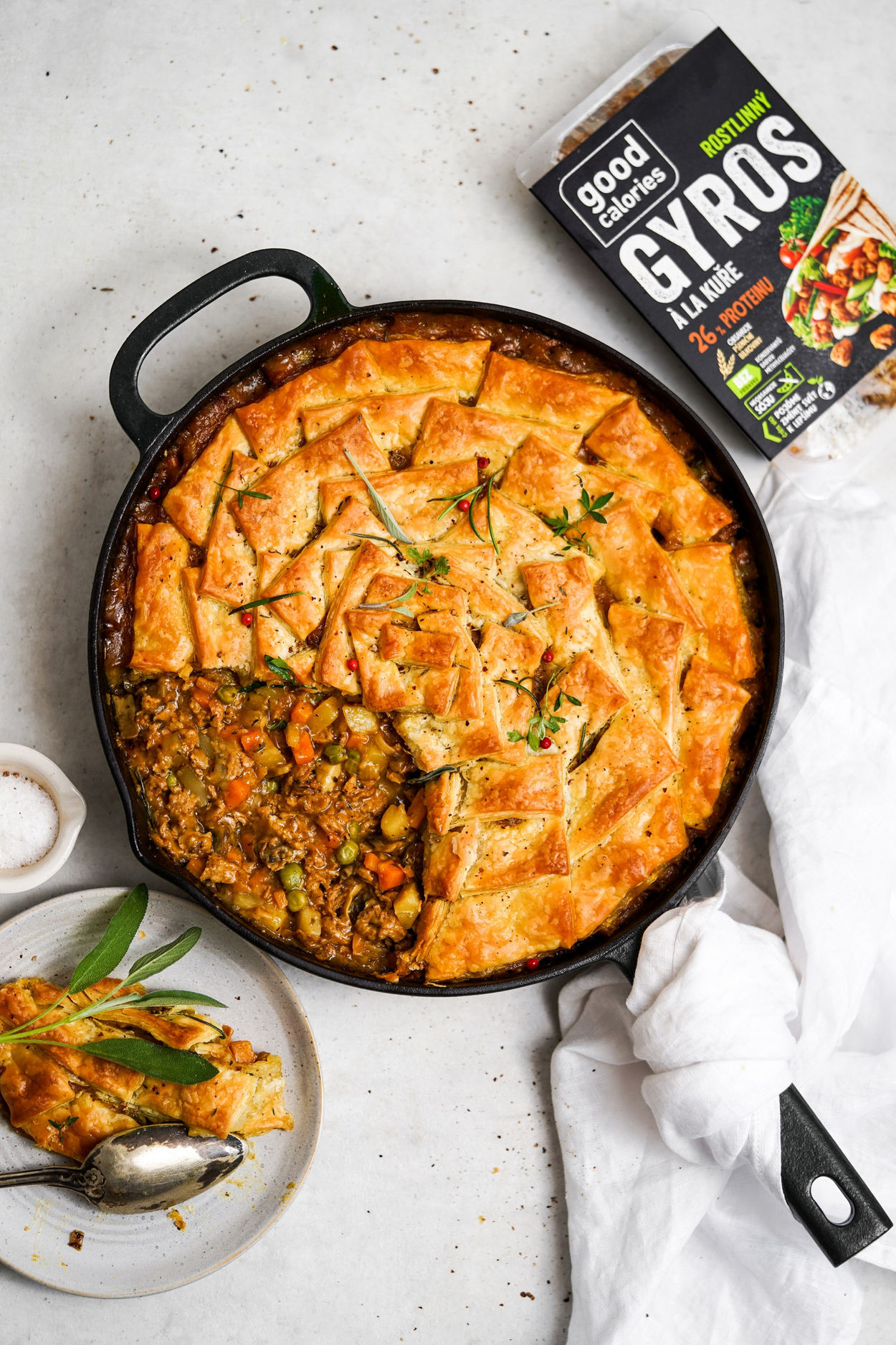 Jedná se o „Kuřecí“ kotlíkový koláč, který tradičně sestává z masových náplní, my však předkládáme náplň rostlinnou, a to Rostlinný gyros à la kuře od Good Calories, který se skvěle uplatní například i v tortillách, s rýží anebo v salátu.
