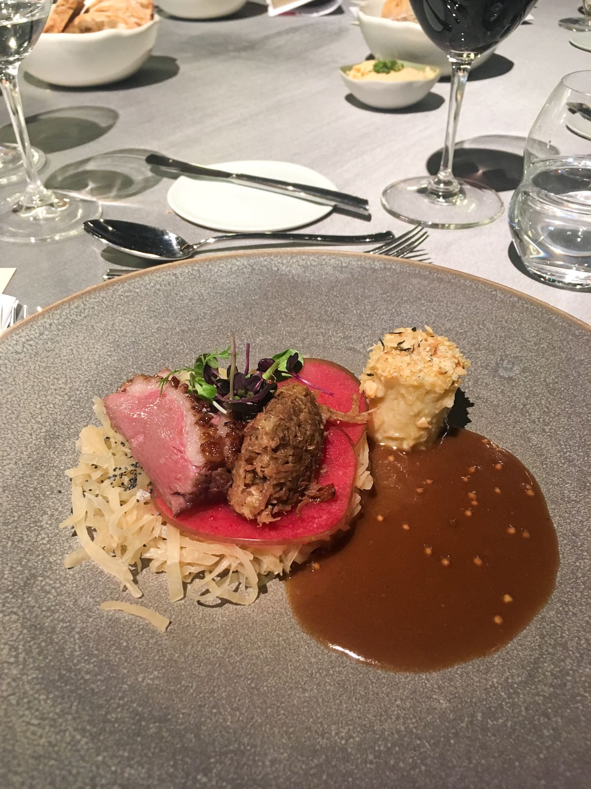 Pokud v duchu tradice nyní čekáte na polovinu husy, skořicové zelí a tři druhy knedlíků, budu vás muset zklamat. I hlavní chod se zde dočkal moderní úpravy. Husu si vychutnáte v podobě filírovaného husího prsíčka a konfitu, tedy masa připravovaného ve vlastním tuku. Doprovod jim na talíři dělá fermentované bílé zelí posypané mákem, jablečné plátky, omáčka z portského vína a malý bramborový knedlíček, který nakonec přeci jen nesmí chybět.