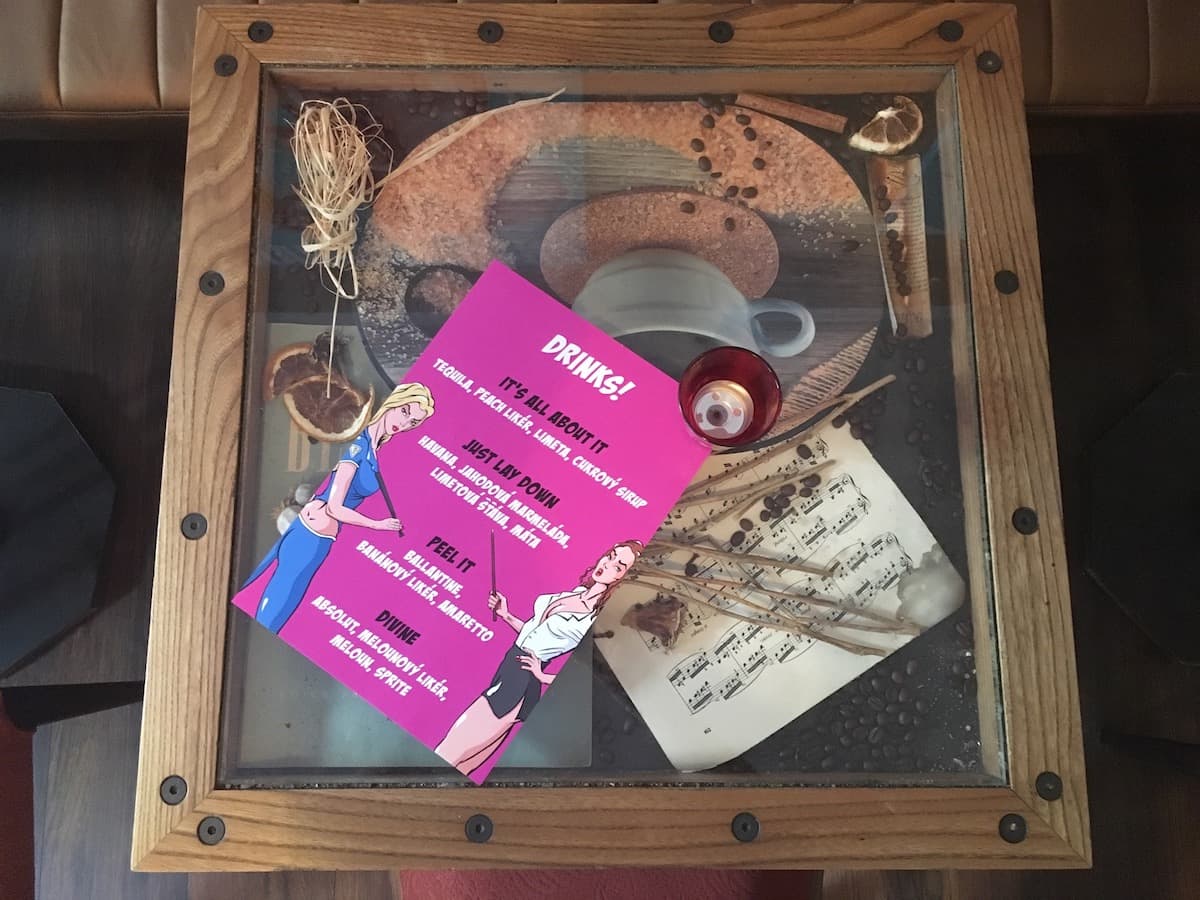 Pro srovnání najdete v zadní části baru, u kulečníku a na popsaných zdech, s nimiž obrazy nádherně kontrastují, i starší obrazy Mátového vlka, které jsou čistě komiksové.